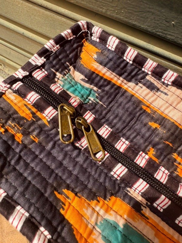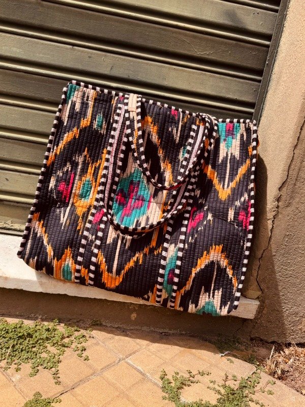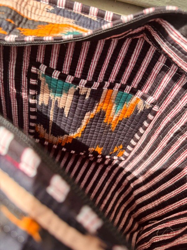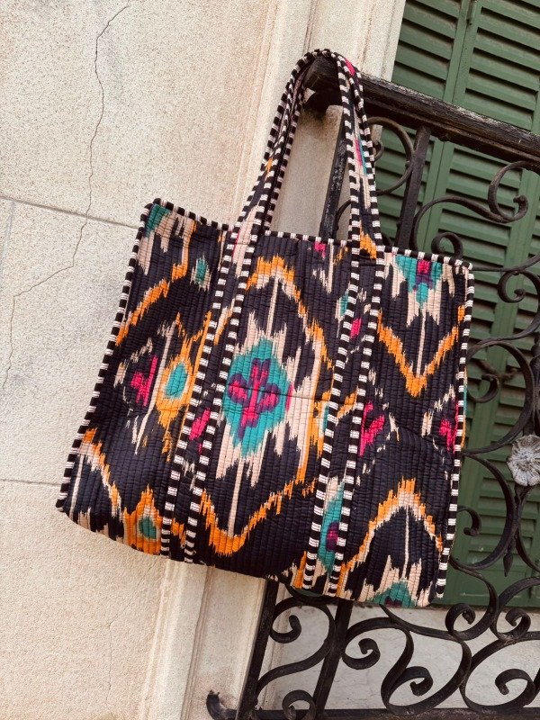 Tote bag confeccionado en doble capa de algodón 100 % de la India, unidas por costuras verticales que crean una textura acolchada, suave y resistente.