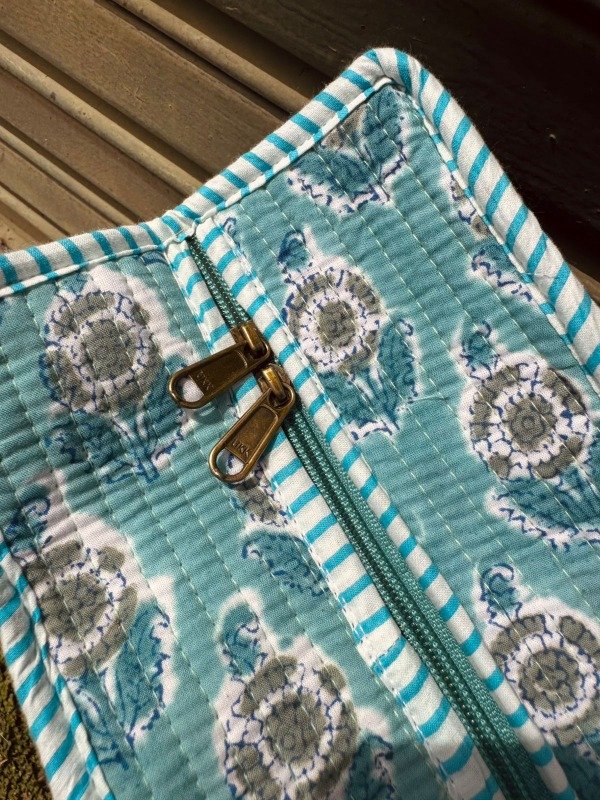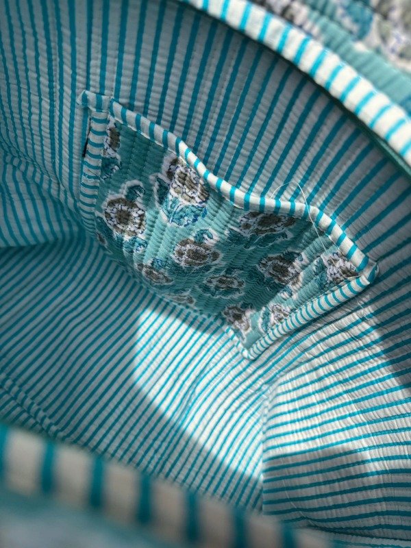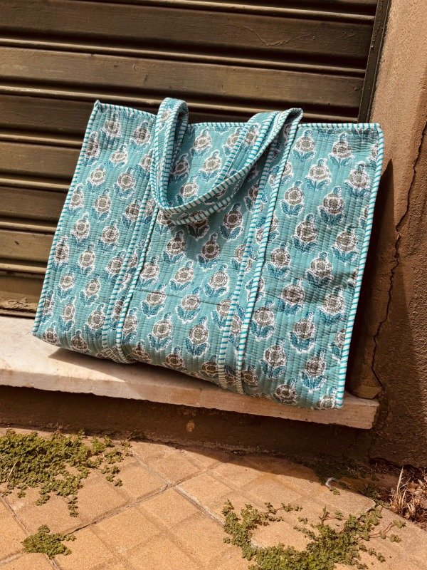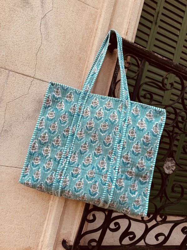 Tote bag confeccionado en doble capa de algodón 100 % de la India, unidas por costuras verticales que crean una textura acolchada, suave y resistente.