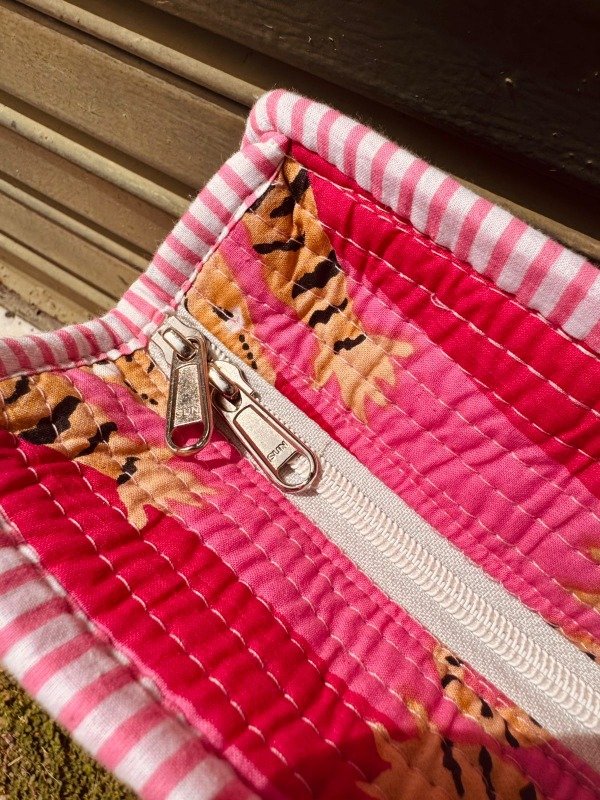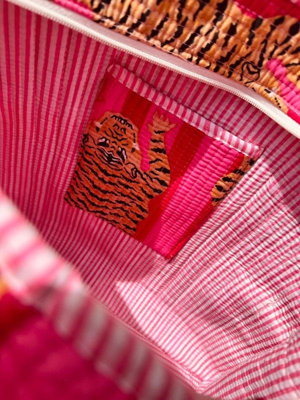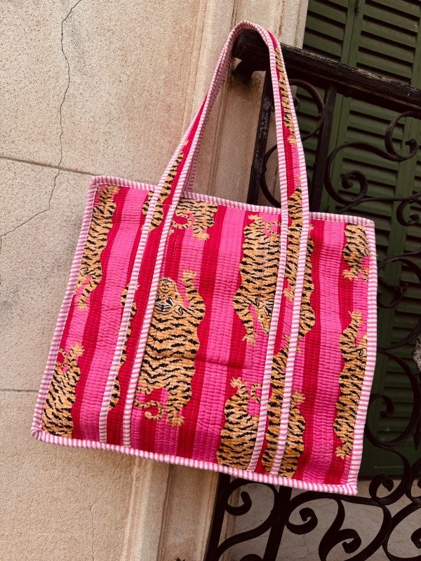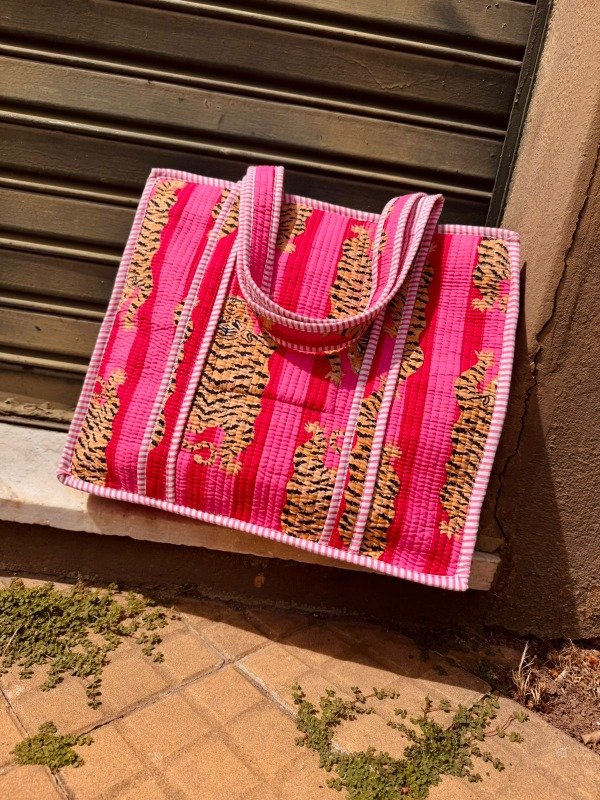 Tote bag confeccionado en doble capa de algodón 100 % de la India, unidas por costuras verticales que crean una textura acolchada, suave y resistente.