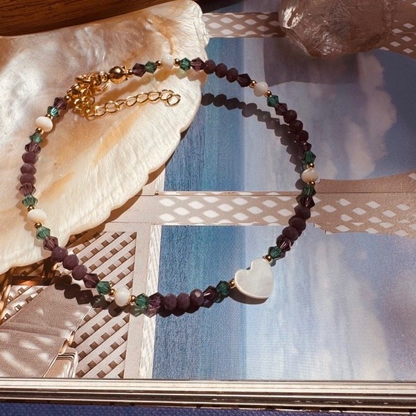 Diseñada con un corazón de nácar en el centro —símbolo de protección y calma— combinado con cristales facetados en tonos violeta y verde botella, y pequeñas perlas de río que aportan luz y equilibrio.