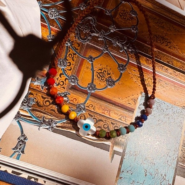 El centro está formado por un ojo de nácar en forma de flor, que protege, limpia y expande la intuición.