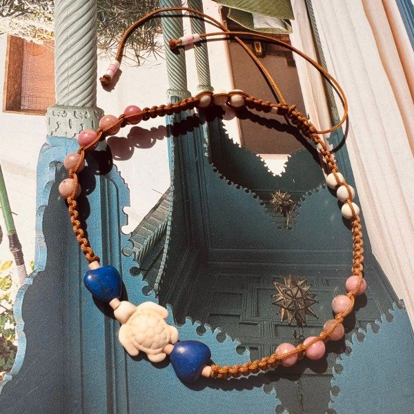 En el centro, una tortuguita tallada en piedra reconstruida simboliza el avance paciente, la fortaleza interior y la protección durante cada proceso, recordándote que el ritmo más sabio es el tuyo. A sus lados, dos corazones de un azul profundo que activan la calma, la verdad y la comunicación consciente: esa certeza silenciosa que te permite expresarte desde un lugar de amor incondicional.
