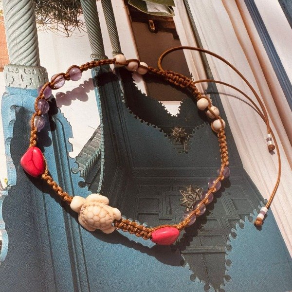 El diseño se completa con cuentas de Amatista auténtica, tejidas a mano en macramé con hilo chino de primera calidad. La Amatista es la piedra de la transmutación y la espiritualidad. Es conocida por su capacidad de calmar la mente, disipar la ira y potenciar la intuición para que tu guía interna sea clara. La verdad no se busca, se recuerda. Es una piedra que acompaña el Despertar de la Conciencia al Favorecer la Calma Mental y la Conexión con tu Propósito Superior.